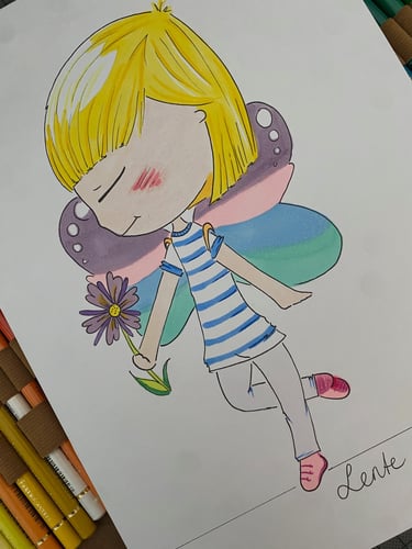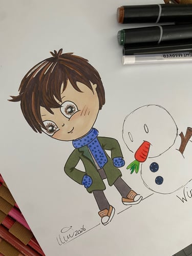 I favor a Japanese chibi style, with a little twist of my own. My preferred materials are alcohol markers, colored pencils and pigment liners and all illustrations are done on paper by hand, without using digital enhancement.